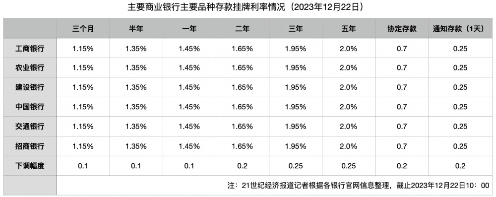 12月22日,终局21世纪经济报谈记者发稿,有五家大行以及股份行中的招商银行通知下调入款利率,退换类型涵盖按期入款中的整存整取、零存整取、整存零取、存本取息等,协定入款、示知入款利率也有下调。